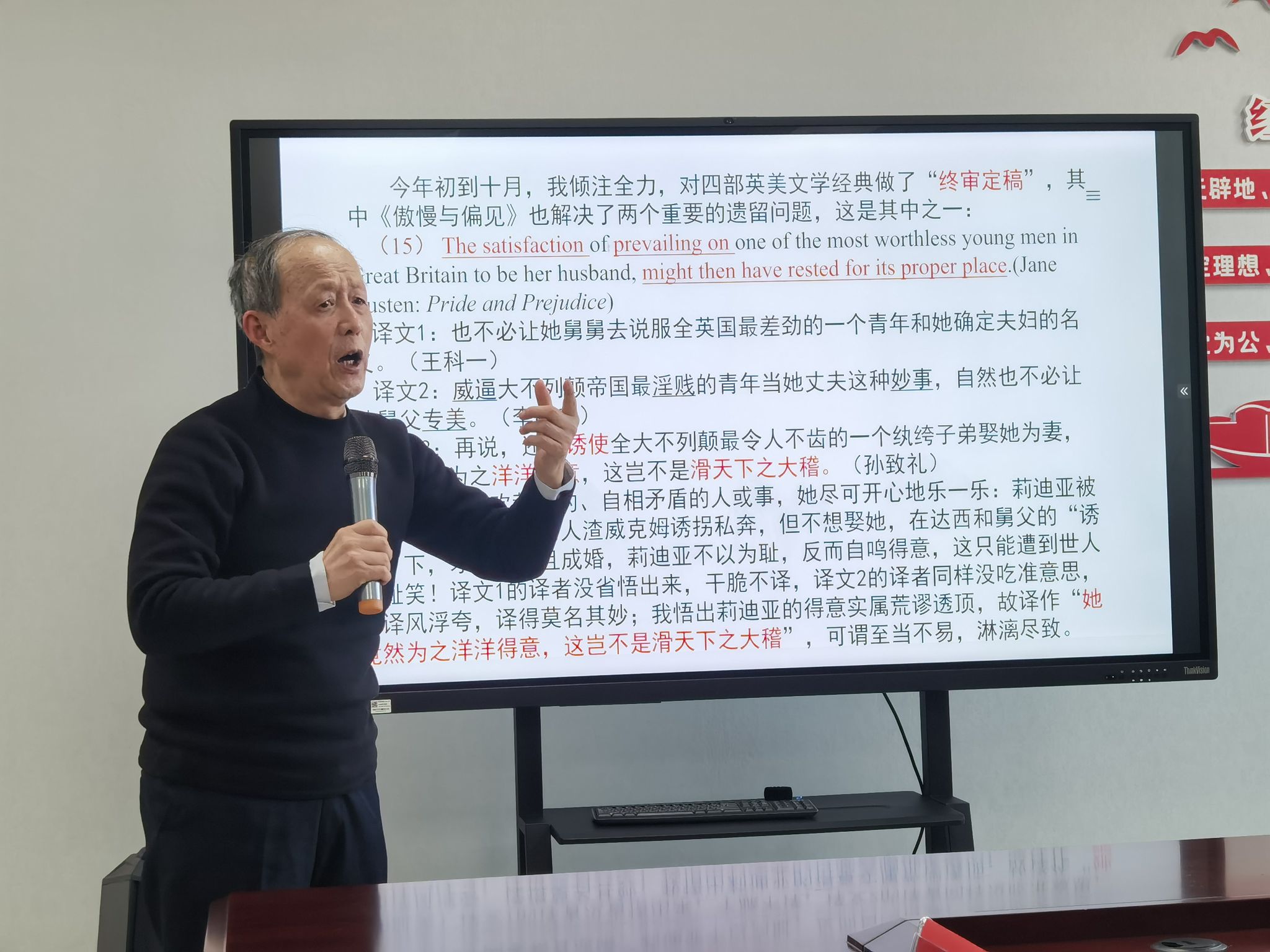 11月21日下午,我国著名翻译家及翻译理论家、中国翻译协会“翻译文化终身成就奖”获得者孙致礼教授应邀为麻豆视频-成人视频麻豆-麻豆av 师生作题为“我的英美文学翻译之道”的学术讲座。孙致礼教授是原解放军麻豆视频-成人视频麻豆-麻豆av 英语语言文学专业学术带头人、博士生导师,代表性译著《傲慢与偏见》《瓦尔登湖》《老人与海》等脍炙人口、长销不衰。本次讲座由院长唐艳芳主持,麻豆视频 教师代表及翻译专业硕士研究生三十余人参加。