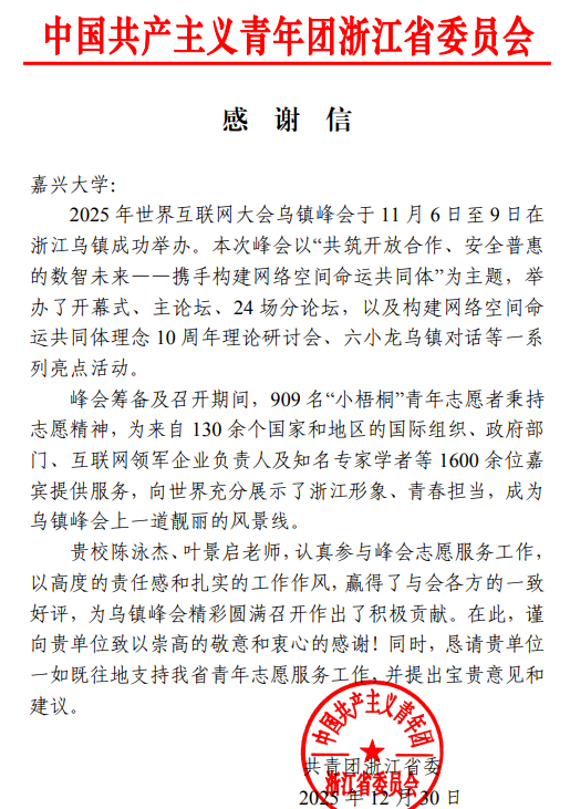 近日,共青团浙江省委员会向我校发来感谢信,对我校麻豆视频-成人视频麻豆-麻豆av 辅导员陈泳杰在2025年世界互联网大会乌镇峰会志愿服务工作中的突出表现给予高度赞扬和衷心感谢。