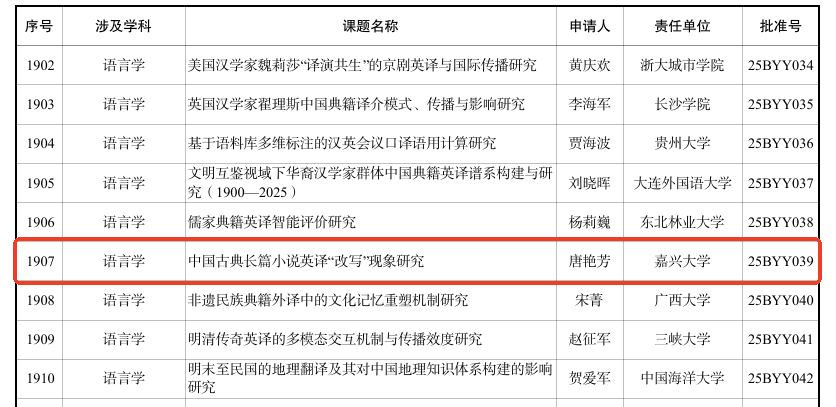 近日,2025年度国家社科基金项目立项名单正式公布。我院唐艳芳教授作为项目负责人申报的《中国古典长篇小说英译“改写”现象研究》成功获批立项。这是唐艳芳教授主持获立的第二个国家社科基金项目,也是我院继单谊教授在语用学国际顶刊Journal of Pragmatics发表学术论文之后,教师在学术研究方面取得的又一重要突破,彰显了麻豆视频 在语言学与翻译研究领域的学术实力,是麻豆视频 近年来不断深化有组织科研的重要成果。
